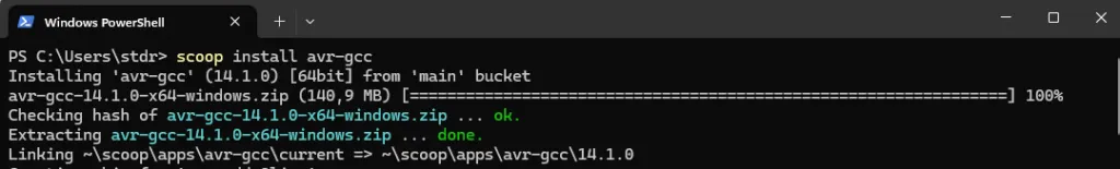 Nachdem Scoop installiert wurde, können wir nun den für unsere Arduino Projekte benötigte AVR-GCC Compiler installieren. Dazu geben wir wiederum über PowerShell nachfolgenden Befehl ein: