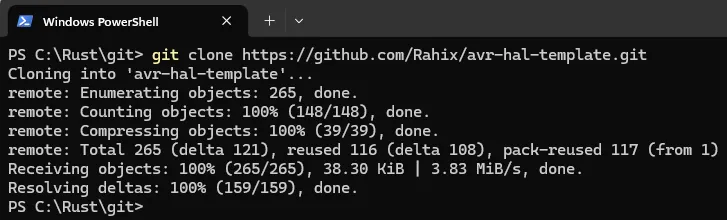 Eigentlich sollte man das Repository mit cargo-generate clonen, jedoch ist dieses Feature in der neuen Version als depricated markiert und somit entfällt es in zukunft. Hier weiche ich von der engl. Anleitung ab und verwende Git.