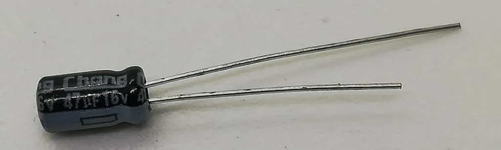 Beim Einbau des 47 µF Kondensators ist auf die korrekte Polarität zu achten, der Kondensator hat eine weiße Markierung wo ein Minuszeichen abgebildet ist und auf der Platine ist eine kleine schraffierte Fläche.