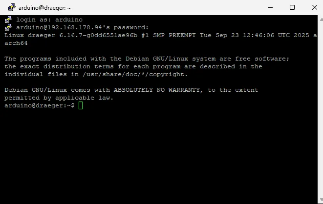 Nachdem die SSH-Verbindung steht, können wir den Arduino UNO Q wie einen klassischen Debian-Server behandeln – und genau das machen wir jetzt.