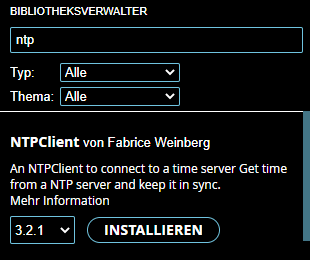 Damit wir mit einem NTP Server kommunizieren können und somit den Zeitstempel erhalten, müssen wir eine zusätzliche Bibliothek installieren