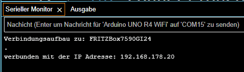 Zunächst müssen wir eine Verbindung zum lokalen Heimnetzwerk aufbauen. Ich habe mir hier das Beispiel ConnectwithWPA.ino vom GitHub Repository arduino / ArduinoCore-renesas gezogen und auf das Minimum gekürzt.