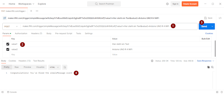 Zunächst fügen wir die Adresse (1) ein (ohne die Parameter), danach setzen wir die Parameter „value1“ & „value2“ (2) und klicken auf „Send“ (3).