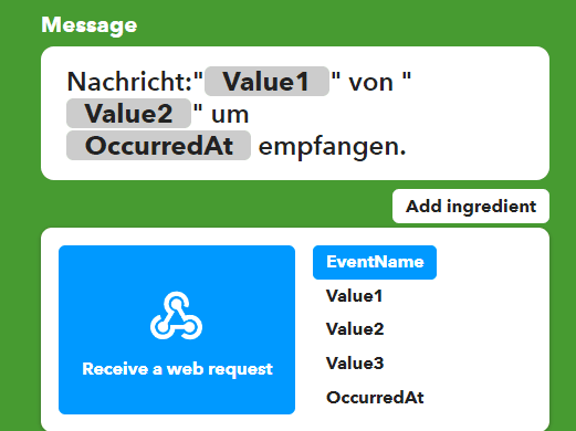 Hier haben wir die 3 verschiedene Werte welche wir mit eigenen Daten belegen können (value1, value2, value3). Zusätzlich können wir noch den Zeitstempel des Events (OccuredAt) einbinden und den EventName.