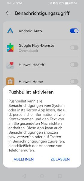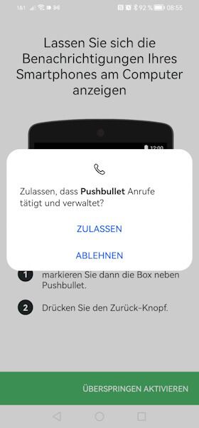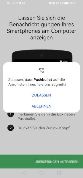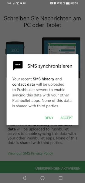 Für die Einrichtung steht ein Wizard bereit, welcher beim ersten Starten der App ausgeführt wird. Hier musst du besonders acht geben, denn die App möchte sehr viele Berechtigungen. In meinem Fall gebe ich keine Berechtigungen für den Zugriff auf meine Kontakte und den SMS Speicher (ich möchte ja lediglich eine Benachrichtigung von meinem Mikrocontroller erhalten).