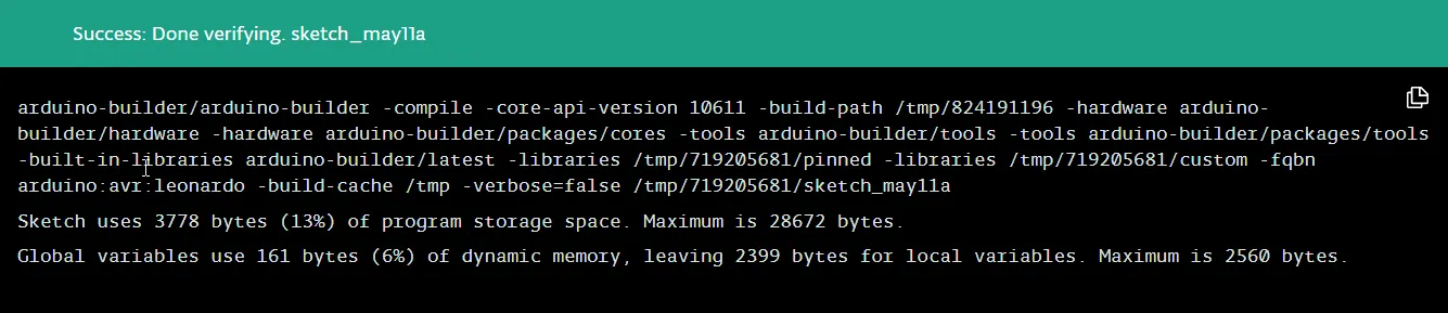 arduino-builder/arduino-builder -compile -core-api-version 10611 -build-path /tmp/214971675 -hardware arduino-builder/hardware -hardware arduino-builder/packages/cores -tools arduino-builder/tools -tools arduino-builder/packages/tools -built-in-libraries arduino-builder/latest -libraries /tmp/097879468/pinned -libraries /tmp/097879468/custom -fqbn arduino:avr:leonardo -build-cache /tmp -verbose=false /tmp/097879468/sketch_may11a Sketch uses 3778 bytes (13%) of program storage space. Maximum is 28672 bytes. Global variables use 161 bytes (6%) of dynamic memory, leaving 2399 bytes for local variables. Maximum is 2560 bytes. Restarting in bootloader mode Get port list before reset [COM11] Touching port COM11 at 1200bps Set DTR off Flashing with command:C:/Users/stefa/.arduino-create/arduino/avrdude/6.3.0-arduino9/bin/avrdude.exe -CC:/Users/stefa/.arduino-create/arduino/avrdude/6.3.0-arduino9/etc/avrdude.conf -q -q -patmega32u4 -cavr109 -PCOM13 -b57600 -D -Uflash:w:C:/Users/stefa/AppData/Local/Temp/arduino-create-agent789211554/sketch_may11a.hex:i Connecting to programmer: . Found programmer: Id = "CATERIN"; type = S Software Version = 1.0; No Hardware Version given. Programmer supports auto addr increment. Programmer supports buffered memory access with buffersize=128 bytes. Programmer supports the following devices: Device code: 0x44