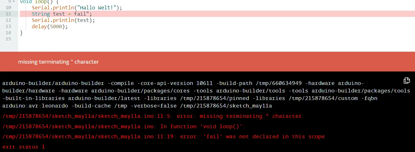 Nachdem also der Fehler behoben wurde (das fehlende Anführungszeichen in Zeile 11) kann der Sketch hochgeladen werden.