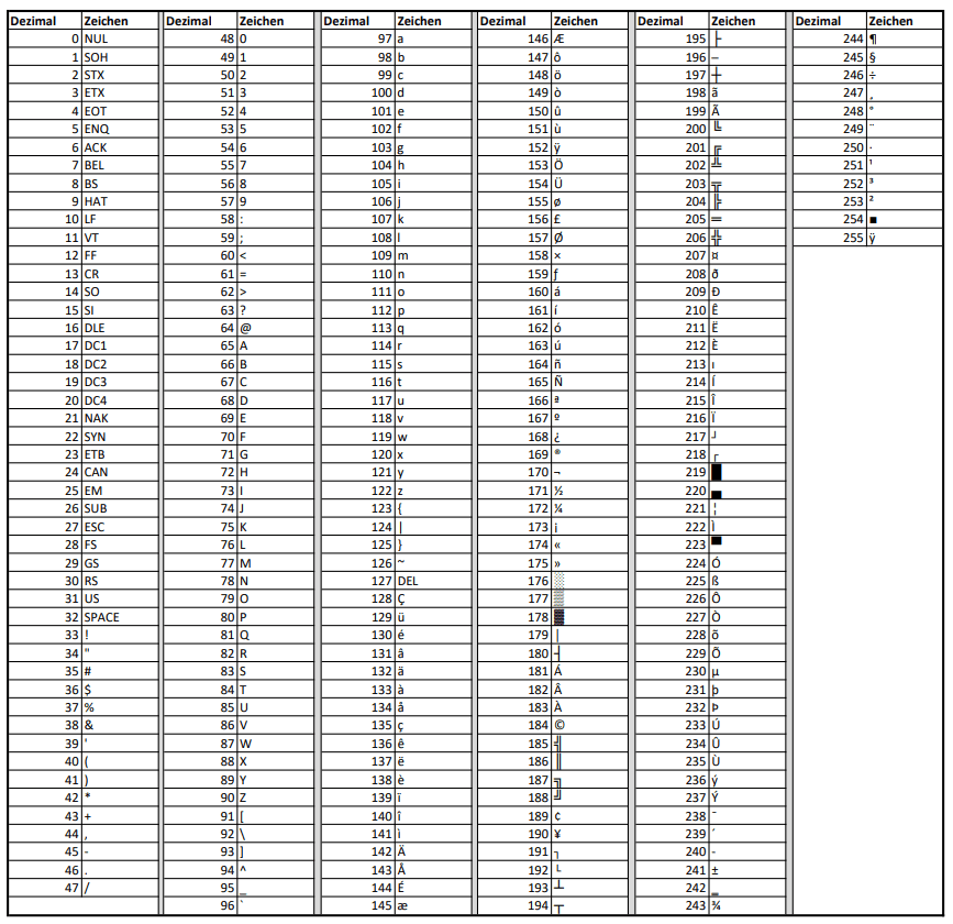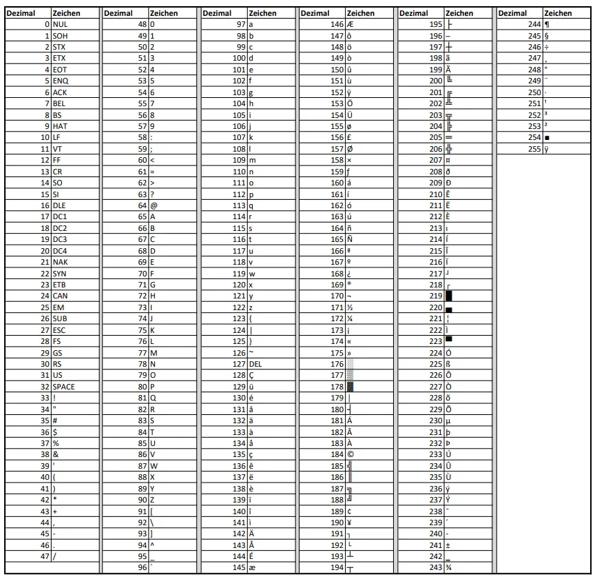 Nachfolgend gebe ich dir die ASCII-Tabelle mit den ersten 256 Zeichen.