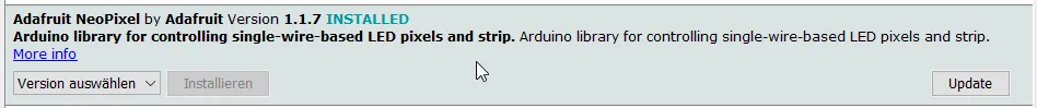 Zum Steuern der RGB LEDs wird vorgeschlagen die Adafruit NeoPixel Bibliothek zu installieren. (Es wird aber ebenfalls auch mit der FastLED Bibliothek funktionieren.) Die Bibliothek kannst du entweder vom GitHub Repository adafruit / Adafruit_NeoPixel als ZIP Datei herunterladen oder aber ganz einfach über den Bibliotheksverwalter.