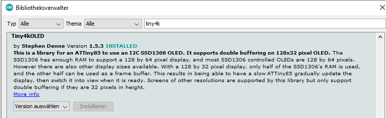 Zunächst benötigst du die Bibliothek „Tiny4kOLED“, diese kannst du bequem über den Bibliotheksverwalter der Arduino IDE installieren.