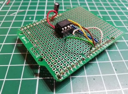 Wenn man mehr als nur einen ATtiny85 beschreiben möchte so kann man sich eine kleine Platine löten und somit die oben beschriebene Schaltung „festhalten“. Dafür benötigen wir neben einfachem, bunten Kabel eine Lochrasterplatine. Wer etwas mehr Geld in die Hand nehmen möchte kann sich hier auch ein Prototype Shield für den Arduino UNO holen und hätte somit eine passende Platine bereits zur Hand.