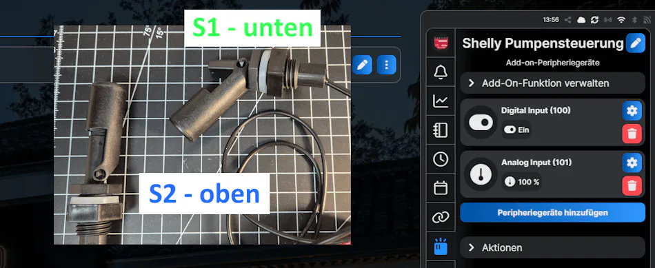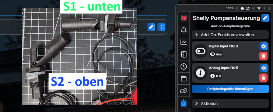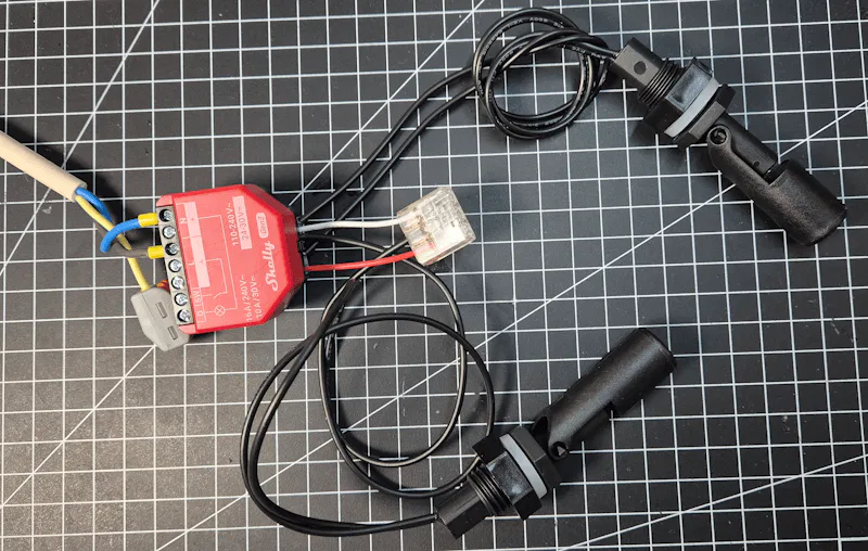 Für die Umsetzung werden zwei Schwimmschalter sowie ein Shelly mit AddOn verwendet. Die beiden Schwimmschalter erfassen den Wasserstand im Keller und bilden die Grundlage für die Steuerung der Pumpe.