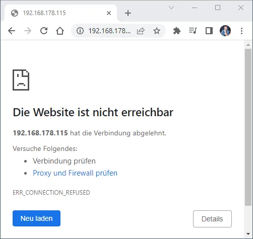 Die IP-Adresse können wir nun im Browser eingeben, jedoch werden wir zunächst nur eine Fehlermeldung.