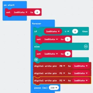 Zunächst wollen wir die 3 LEDs gleichzeitig blinken lassen.