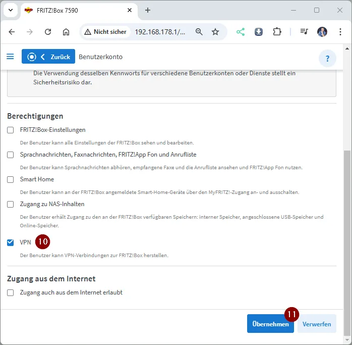 Im nächsten Dialog vergeben wir einen Benutzernamen (8) und ein Kennwort (9). Weiter unten setzen wir zusätzlich den Haken bei „VPN“ (10), um die VPN-Funktion für diesen Benutzer zu aktivieren, und bestätigen die Eingabe mit einem Klick auf „Übernehmen“ (11).