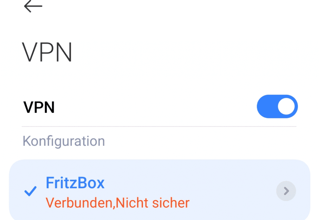 Wir sollten jetzt auf der Übersichtsseite der VPN-Verbindungen sein. Der Haken an der Verbindung bedeutet nicht das eine Verbindung existiert, damit wir die VPN-Verbindung aufbauen müssen wir den Schieberegler bei VPN nach rechts bewegen.