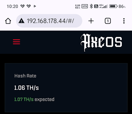 Da wir jetzt mit dem Netzwerk verbunden sind, können wir ganz einfach die Adresse vom Bitaxe Gamma im Browser eingeben und gelangen wieder zum AxeOS.