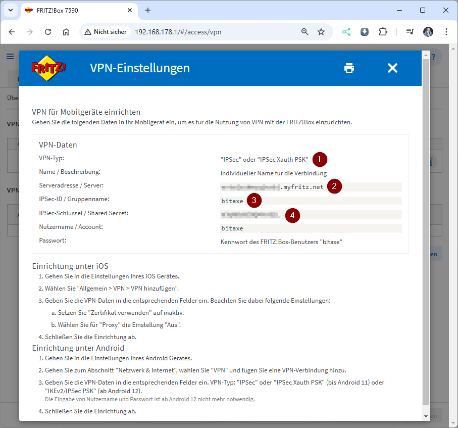 Damit wir mit dem Handy auf das lokale Fritz!Box Netzwerk zugreifen können, haben wir jetzt einen Benutzer für die VPN-Verbindung sowie das MyFRITZ! Konto eingerichtet. Damit haben wir die Vorbereitung geschaffen, mit unterschiedlichen Geräten auf das lokale Netzwerk zugreifen zu können.