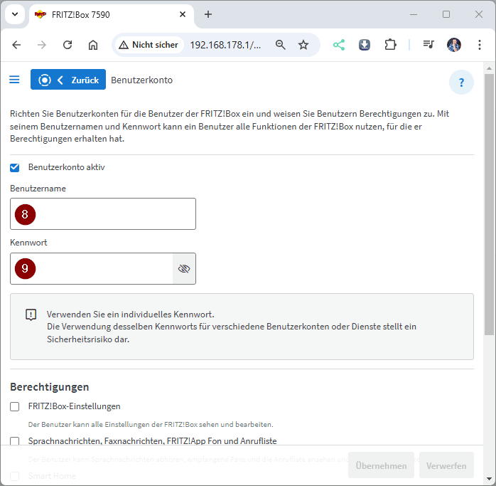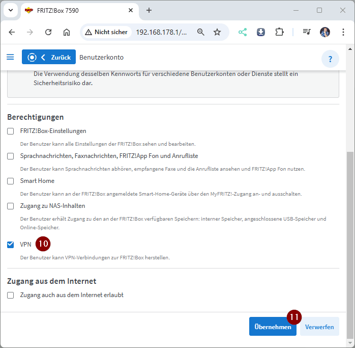 Im nächsten Dialog vergeben wir einen Benutzernamen (8) und ein Kennwort (9). Weiter unten setzen wir zusätzlich den Haken bei „VPN“ (10), um die VPN-Funktion für diesen Benutzer zu aktivieren, und bestätigen die Eingabe mit einem Klick auf „Übernehmen“ (11).