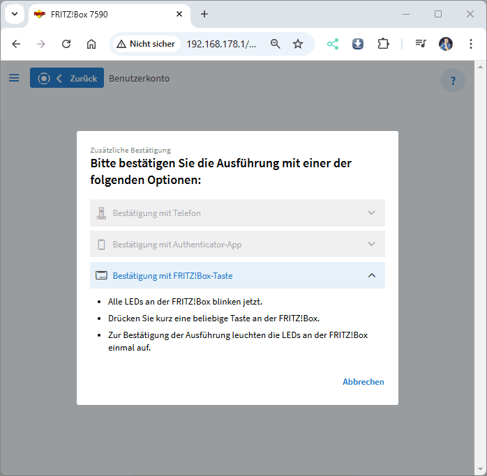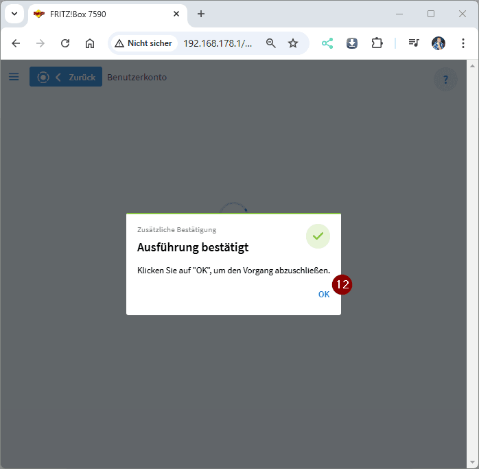 Um die Einrichtung des neuen Benutzers abzuschließen, wird die Bestätigung durch Drücken einer Taste an der Fritz!Box erforderlich. Hierfür kann beispielsweise die WLAN-Taste verwendet werden. Sobald die Bestätigung erfolgt ist, können wir den Einrichtungsassistenten durch einen Klick auf „OK“ (12) verlassen.