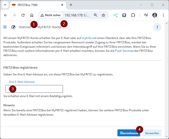 Navigieren wir zunächst über Internet (1) > MyFRIZT! Konto (2). In diesem Dialog geben wir eine gültige E-Mail-Adresse ein (3) und bestätigen diese mit der Schaltfläche Übernehmen (4). Wir erhalten nun eine Bestätigungsmail, in welcher wir einen Link finden, welchen wir anklicken müssen, damit dieses Konto aktiv wird.
