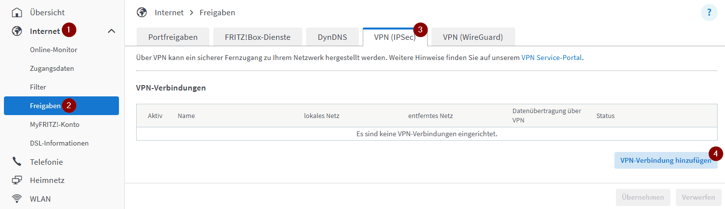 Im ersten Schritt öffnen wir die Oberfläche der Fritz!Box und navigieren über Internet (1) > Freigaben (2) zum Reiter VPN(IPSec) (3). Dort wählen wir die Schaltfläche VPN-Verbindung hinzufügen (4).