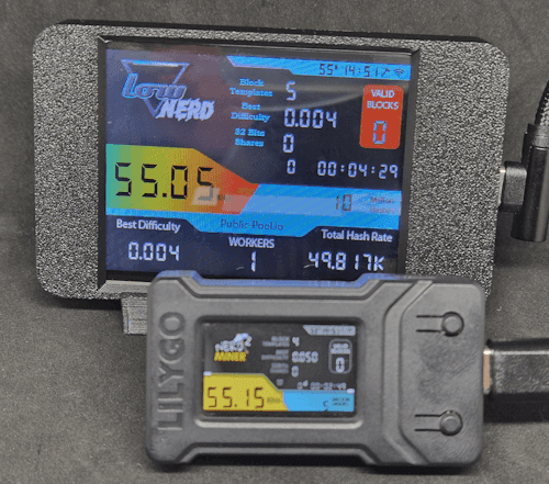 - Nerd Miner-Modus: Hier bist du Teil eines Netzwerks, das gemeinsam daran arbeitet, einen kompletten Bitcoin-Block (aktuell 6,25 BTC inkl. aller Transaktionsgebühren) zu finden. Der Erfolg hängt stark vom Glück ab, da nur derjenige, der den Block löst, den gesamten Ertrag erhält. Es ist also eine Art „alles oder nichts“-Ansatz.