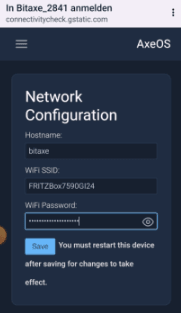 Das Passwort ist hier mit „anything123“ belegt, dieses dient nur als Platzhalter, du kannst in den Settings unter AxeOS ein beliebiger Text eintragen und dieses wird als Passwort akzeptiert.