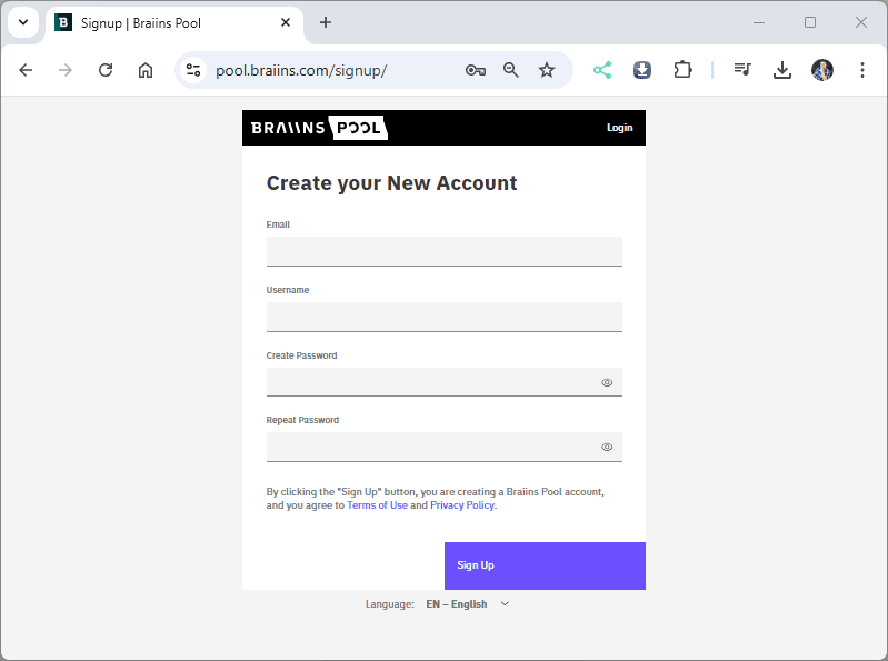 Im ersten Schritt müssen wir uns ein kostenfreies Konto unter https://braiins.com/pool anlegen. Du benötigst dafür eine E-Mail-Adresse, Benutzernamen sowie ein Passwort.