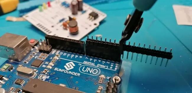 Wenn du die Stiftleisten angepasst hast, dann steckst du diese auf den Arduino UNO und platzierst die Platine darauf. Damit kannst du nun die Platine mit den Stiftleisten verbinden und kannst dir somit sicher sein, dass diese im korrekten Winkel angebracht werden.