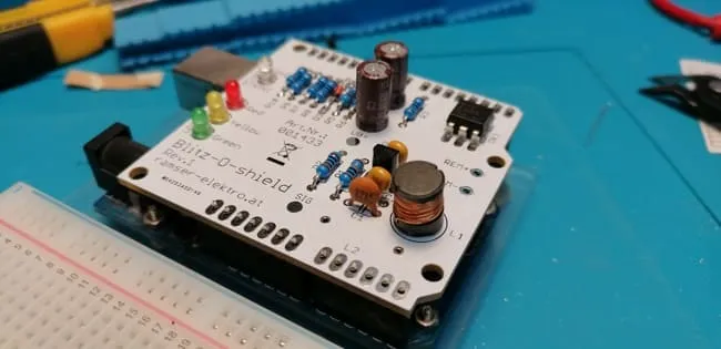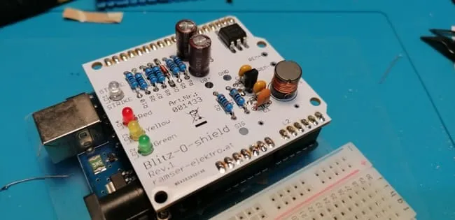 Da bei uns zzt. kein Gewitter angekündigt ist, konnte ich bis heute das Shield nicht testen, jedoch mit einem Piezo Feuerzeug konnte ich die weiße LED zum Aufleuchten bringen (siehe kurzes Video).