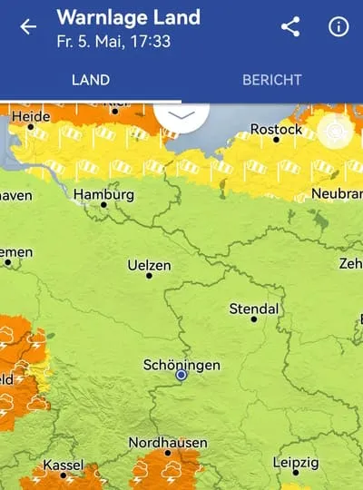 Für heute Abend (05.05.2023) ist bei uns in Niedersachsen ein Gewitter angekündigt, jedoch nicht in unserer Region.