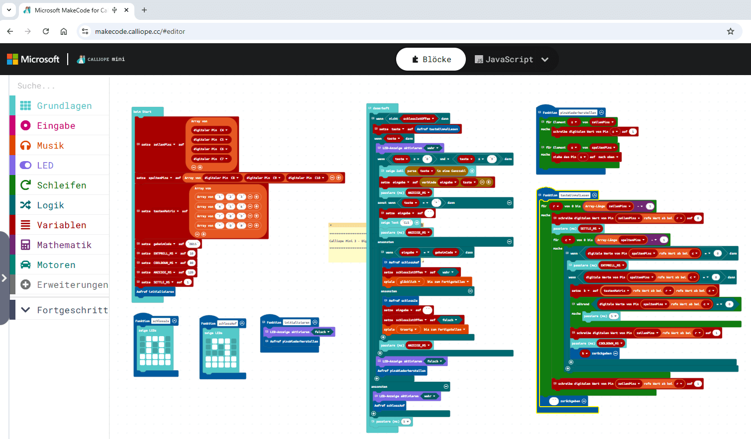 Im folgenden Abschnitt findest du den kompletten JavaScript-Code für unser digitales Schloss mit Tastenfeld.