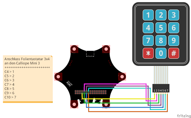 Das 3×4-Tastenfeld besitzt 7 Anschlüsse: vier für die Zeilen und drei für die Spalten. Diese werden mit den digitalen Pins des Calliope Mini verbunden. Über die Kombination aus Zeilen und Spalten kann später jede Taste eindeutig erkannt werden.