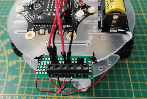 Wie im letzten Beitrag bereits gezeigt, habe ich mir eine kleine Anschlusspaneele gelötet, mit welcher ich die Litzen, welche von den DC-Motoren kommen, einfach auf Buchsenleisten via Schraubklemmen umleiten kann. Das macht das Anschließen deutlich einfacher, da so die Kabel besser und sicherer mit dem Mikrocontroller verbunden werden.