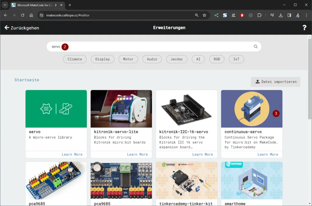 Zum steuern des Servomotors benötigen wir eine Erweiterung, diese heißt „ContinuousServo“ und diese kannst du dir recht einfach über den Menüpunkt Erweiterungen (1) laden. Danach suchst du nach „servo“ (2) und wählst aus den Suchergebnissen „continuous-servo“ (3) aus.