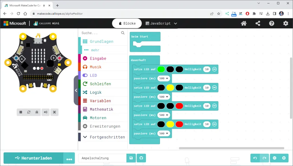 Das fertige kleine Programm für die Ampelschaltung am Calliope Mini 3