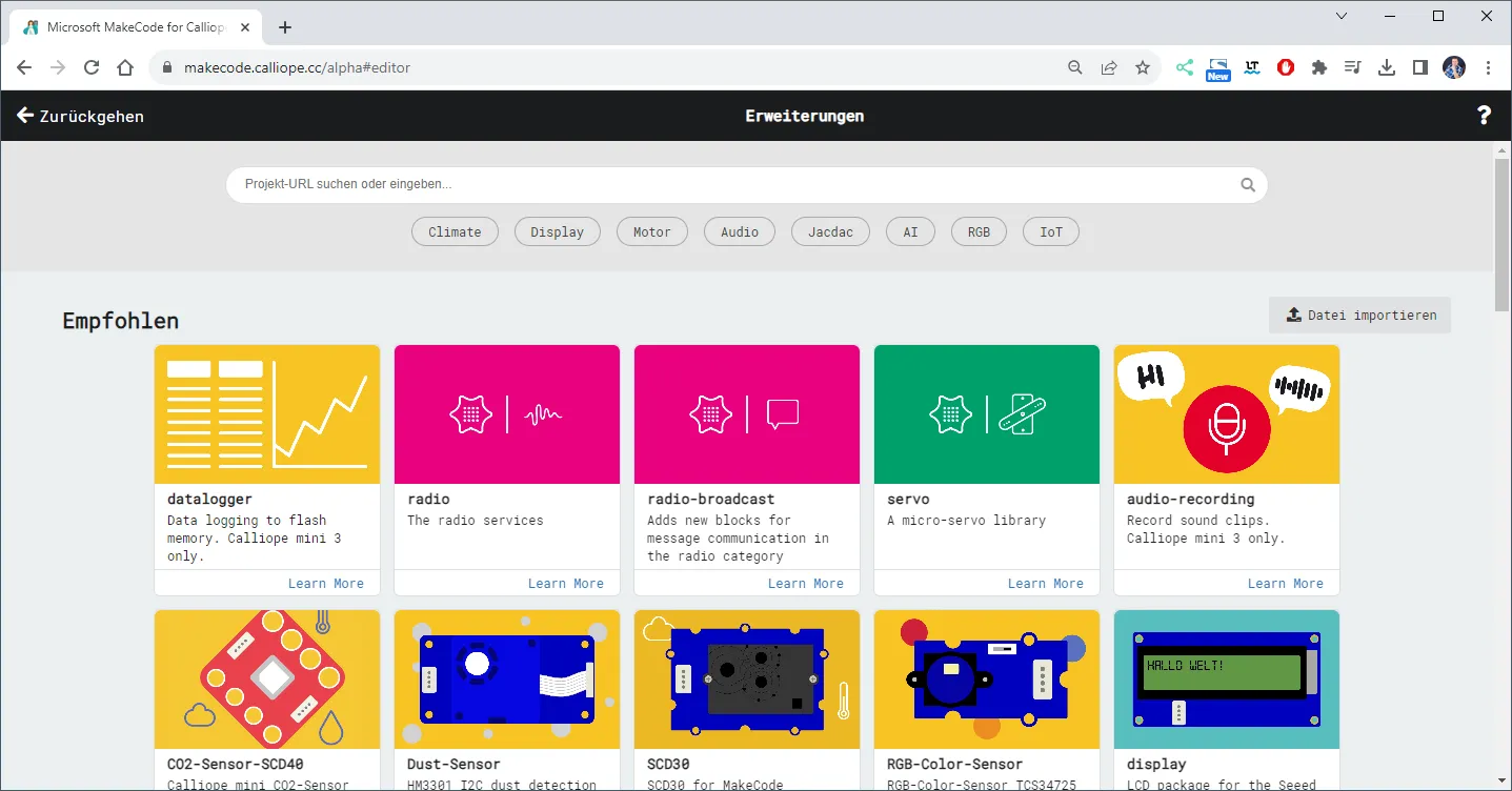 Nachfolgend findest du das kleine Programm zum download. Du brauchst dir lediglich die HEX-Datei in MakeCode importieren, die Erweiterung gibt es quasi dazu.
