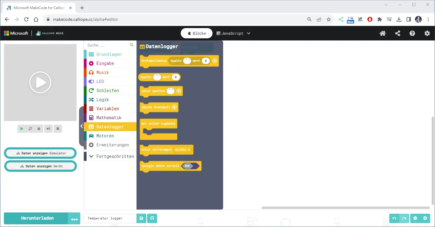 Sobald die Erweiterung datalogger geladen ist, sehen wir einen neuen Menüeintrag „Datenlogger“ mit vielen neuen Blöcken.