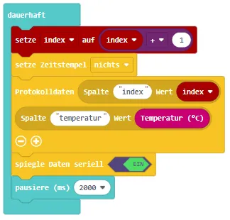 Danach folgt der Block für das Speichern der Daten in einer Zeile Index & Temperatur.