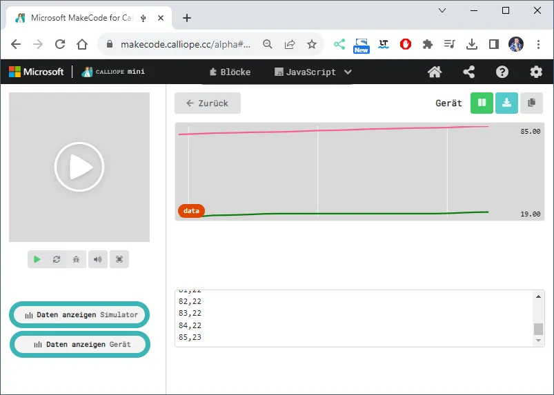 In diesem Beitrag möchte ich das Feature Datenlogger in der neuen Version von MakeCode für den Calliope Mini 3 vorstellen. Auf dem Calliope Mini findest du einige Sensoren und auch Aktoren, darunter ist ein Temperatursensor, von diesem möchte ich nun die Daten über einen Zeitraum aufzeichnen und mit dem Datenlogger können diese dann als TXT-Datei oder CSV-Datei exportiert werden.