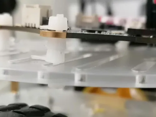 Mein 2WD Chassis hat zwei Acrylplatten, auf diese kann ich ganz einfach mit Kabelbinder diesen befestigen. Dazu stecke ich einen Kabelbinder durch einen Schlitz und schiebe auf diesen zwei weitere so das ich einen Abstand zwischen der Platte und dem Mikrocontroller erhalte.