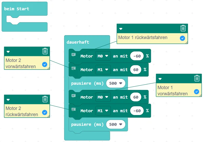 Dazu haben wir unter dem Menüpunkt „Motoren“ einen Block über welchen wir den Motor 1 „M0“ und Motor 2 „M1“ vorwärts (positiver Zahlenwert) und rückwärts (negativer Zahlenwert) fahren lassen können.