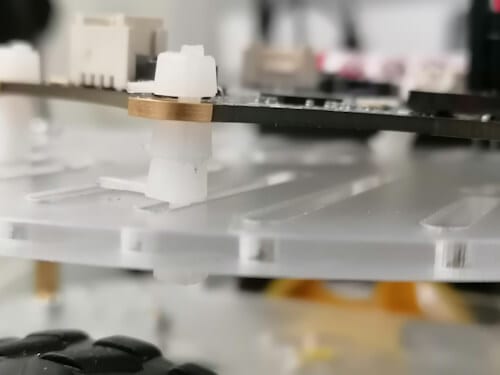 Mein 2WD Chassis hat zwei Acrylplatten, auf diese kann ich ganz einfach mit Kabelbinder diesen befestigen. Dazu stecke ich einen Kabelbinder durch einen Schlitz und schiebe auf diesen zwei weitere so das ich einen Abstand zwischen der Platte und dem Mikrocontroller erhalte.