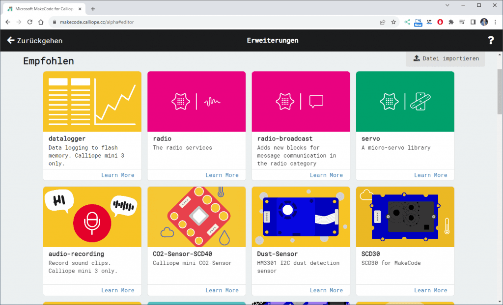 Wenn du dir dieses kleine Programm in MakeCode importierst, dann brauchst du nicht die Erweiterung zuvor laden, denn diese ist dort bereits enthalten.