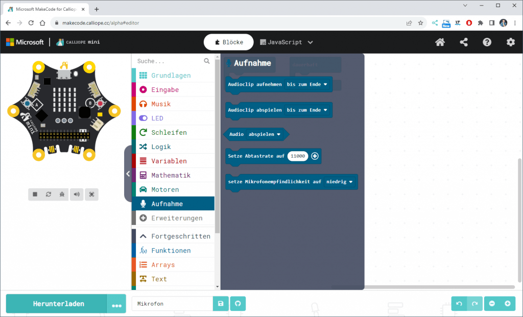 Schade ist nur, dass nicht genügend Speicher am Calliope Mini 3 zur Verfügung steht, um mehr als eine Aufnahme zu speichern und auch wird die Aufnahme im flüchtigen Speicher abgelegt, so das diese nach einem Klick auf den RESET-Button oder in MakeCode auf „Herunterladen“ gelöscht wird. Vielleicht wird dieses bei der Entwicklung einer weiteren Calliope Version berücksichtigt.