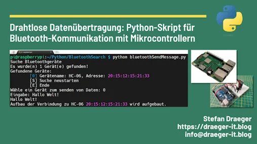 In diesem Beitrag möchte ich dir ein Python-Skript für die drahtlose Bluetooth-Kommunikation zwischen einem Raspberry Pi und einem Mikrocontroller präsentieren. Mit diesem Skript kannst du recht einfach Zeichenketten senden und so auf einem Mikrocontroller Befehle ausführen. Wie du auf einem Raspberry Pi die drahtlose Kommunikation via Bluetooth aktivierst, habe ich dir im Beitrag Schritt-für-Schritt-Anleitung: Einrichten…