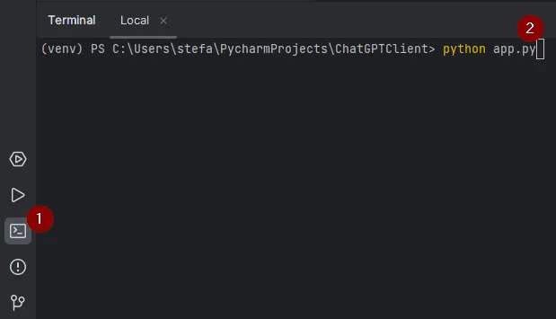 Dazu öffnen wir das lokale Terminalfenster (1) und geben „python app.py“ (2) ein und bestätigen dieses mit Enter.