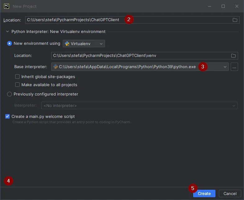 Über den Wizard erstellst du in wenigen Schritten ein leeres Projekt. Zunächst wählen wir die Schaltfläche „New Project“ (1), um im nächsten Fenster den Projektnamen / Ordnernamen (2) einzugeben. Wenn du mehrere Versionen von Python installiert hast, musst du unter Base Interpreter (3) den korrekten Python Interpreter wählen. Sollten Fehler auftreten oder andere Hinweise zur Konfiguration existieren, dann wird dieses im Bereich der Nummer 4 angezeigt.