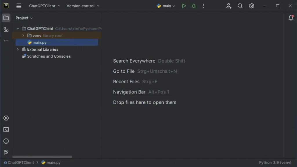 Erstellen wir zunächst ein leeres Projekt in PyCharm. Von ChatGPT lassen wir uns lediglich die Dateien bzw. den Code erstellen.
